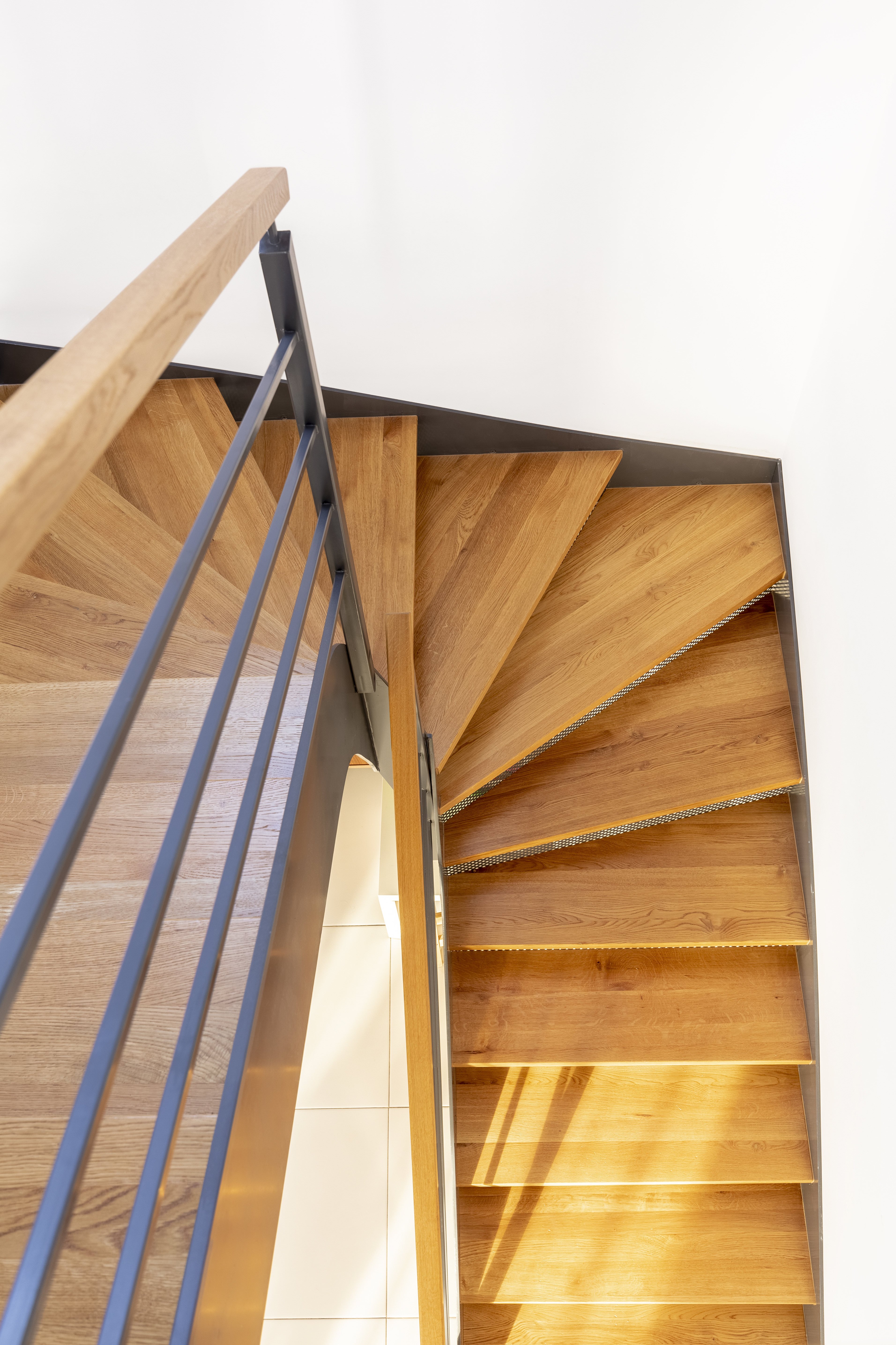 Top view of a wooden staircase with white wall and metal railing Published July 14, 2019 at 3825 × 5737 in Top view of a wooden staircase with white wall and metal railing ← Previous Next →
